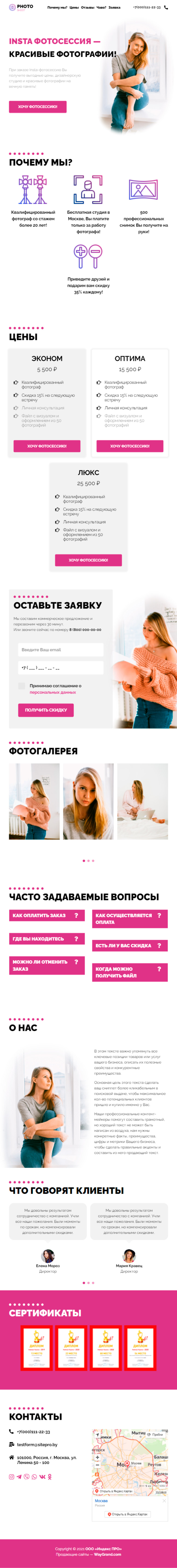 - Промоблок "INSTA ФОТОСЕССИЯ" с кнопкой призыва к действию "Хочу фотосессию"